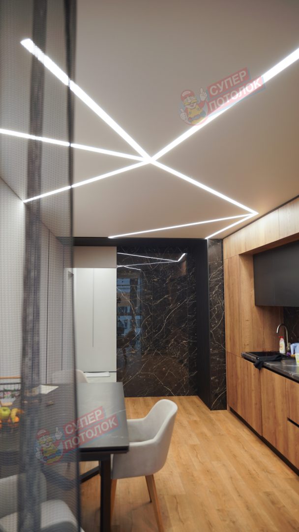 Натяжные потолки со световыми линиями представляют собой инновационную конструкцию, в которой светодиодные ленты монтируются в специальные ниши между полотнами или в разрезы натяжного потолка. Такой прием позволяет создавать на потолке светящиеся линии различной конфигурации – прямые, изогнутые, пересекающиеся, образующие геометрические фигуры или абстрактные узоры.