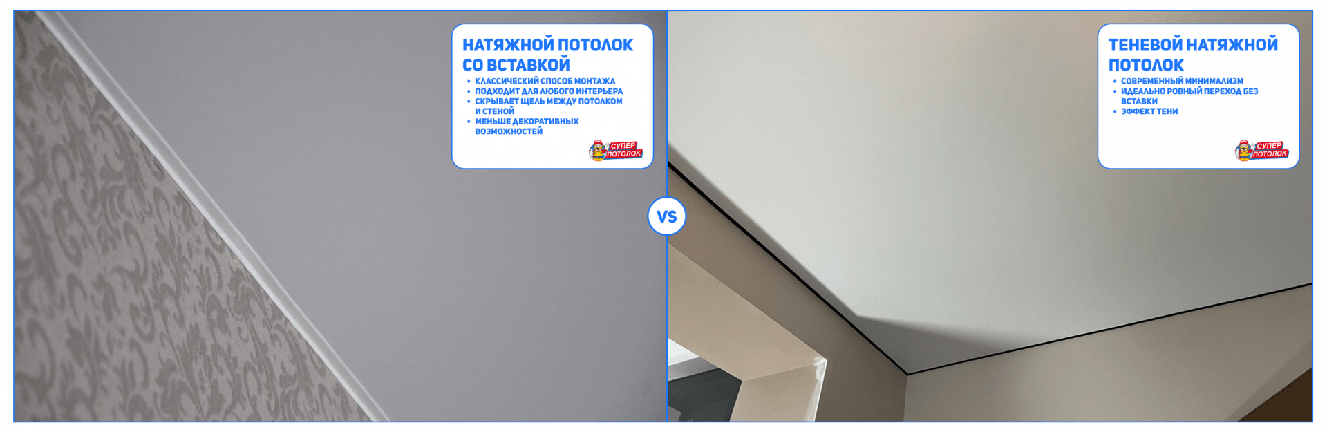 Стандартный натяжной потолок эконом варианта решает задачу скрыть неприглядную щель между полотном и стеной, пряча её за резиновой вставкой. На первый взгляд это выглядит аккуратно, однако со временем резиновая заглушка способна пожелтеть от ультрафиолета, отрезвониться из‑за усадки здания или попросту отвалиться. Если стены неровные, вставка идёт волной, подчёркивая огрехи геометрии. Теневой потолок, напротив, делает акцент не на маскировке, а на идеальном сопряжении: алюминиевый профиль надёжно фиксируется по периметру, исключая люфт, а сам зазор остаётся неизменным на протяжении всего срока службы. Чёрная линия не меняет цвет, не деформируется и гармонично сочетается как с лаконичным минимализмом, так и с дорогим классическим интерьером. В итоге теневой вариант выглядит актуальным, подчёркивает премиальный статус помещения и не требует дополнительных декоративных элементов, которые приходится регулярно обновлять в классическом решении.